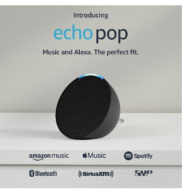 - Included in the box: Echo Pop, glacier white power adapter (15W), and Quick Start Guide.