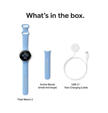 - What's in the box: Google Pixel Watch 2, Active Band (small and large), USB-C Fast Charging Cable, Quick Start Guide