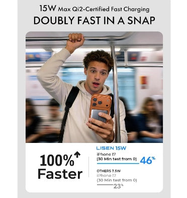 LISEN magnetic power bank is just 0.3 inches thick, thinner than an iPhone 15, offering mobile freedom without bulk. Keep your devices fully charged without being encumbered. LISEN Ultra Slim Power Bank has FCC, CE-EMC, CE-LVD, CE-RED, CEC+DOE, RoHS, UL, PSE, RCM, CB62133 - Qi2 certifications to ensure the safety of use.
