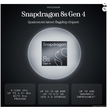 - Processor: Qualcomm SM8735 Snapdragon 8s Gen 4 | Adreno 825