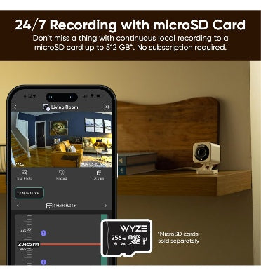 Secure continuous recording on a microSD card up to 512 GB (sold separately) for 24/7 coverage without the need for a subscription