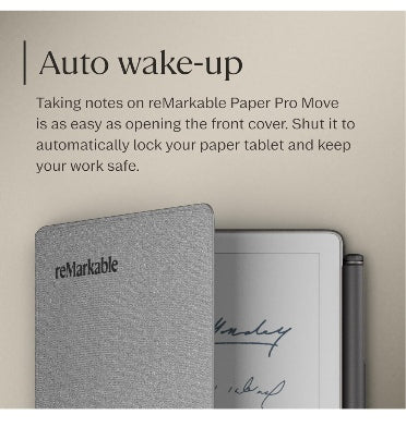 Thanks to sensors inside Book Folio, taking notes on reMarkable Paper Pro Move is as easy as opening up the front cover. Close the cover to automatically lock your device, preserving battery while also keeping your notes private.