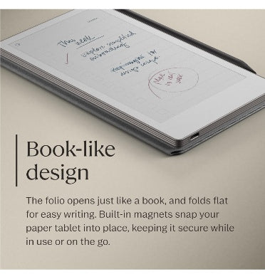 The folio opens just like a book, and folds flat for easy writing. Built-in magnets snap your paper tablet into place, keeping it secure when using it or on the go.