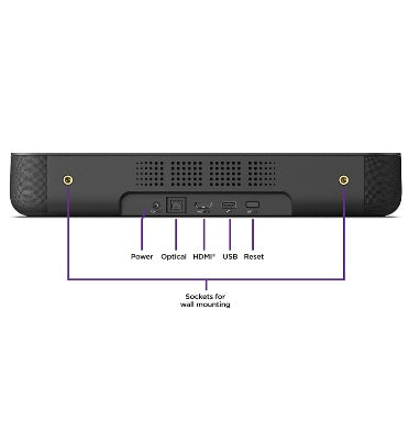 - Ports: Power, HDMI 2.0a (ARC), Optical Input (S/PDIF Digital Audio), USB 2.0