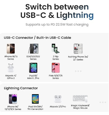 Competible with both iPhone and Android phones with our interchangeable connectors design. Just pop out and snap on. Easy.
