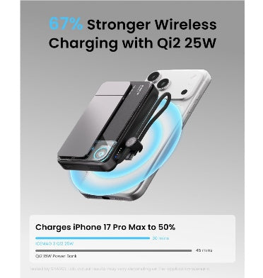 *Laboratory data: Charging 50% of the iPhone 17 Pro in 30 mins. Up to 67% faster than standard Qi magnetic power banks.