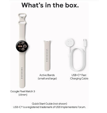 - What’s in the Box: Google Pixel Watch 3, Active Band (small and large wristbands)