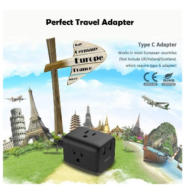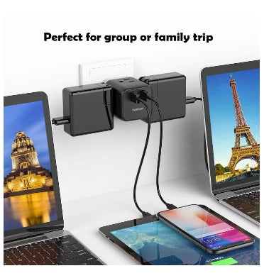 • 5 IN 1 MULTI OUTLET ADAPTER – This international multi outlet European wall plug adapter comes with 2 USB charging ports + 3 USA outlets (2 or 3 prong standard N American).