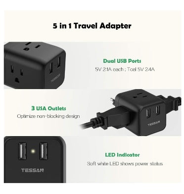 • COMPACT SIZE and INDICATOR- TESSAN type C plug adapter is durable and compact size for Travel. Save your luggage space instead of loading additional power bricks. 3 USA outlets will not interfere with each other. The soft white led light lets you know the power is on/off.