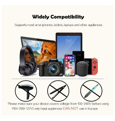 • NOTE – This is NOT A CONVERTER between VOLTAGES, Type C compatible countries are 220V input, different from American 110V input. Please make sure your AC outlet devices input is dual voltage, which cover 100-240V before use, otherwise you may need to use it with an extra bulky voltage converter.