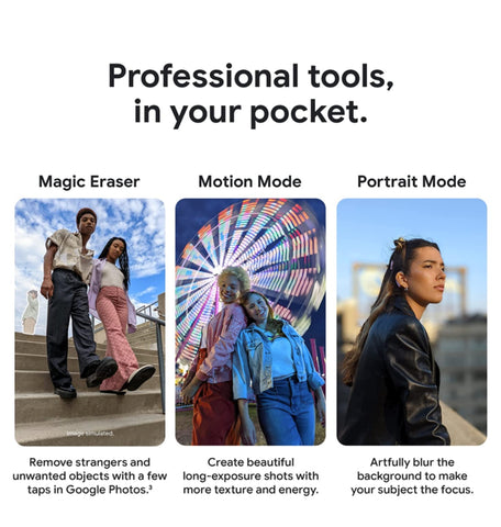 - Camera Features: Magic Eraser, Motion Mode, Real Tone, Face Unblur, Panorama, Manual white balancing, Locked Folder, Night Sight, Top Shot, Portrait Mode, Portrait Light, Super Res Zoom, Motion autofocus, Frequent Faces, Dual exposure controls, Live HDR+