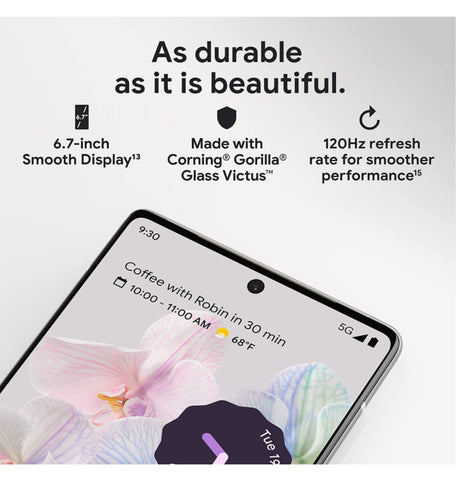 Pixel 6 Pro’s 6.7-inch Smooth Display is made with Corning® Gorilla® Glass Victus™, the toughest Gorilla Glass yet, with up to 2x better scratch resistance than previous Pixel phones. And with IP68 protection, it can take a little water and dust.