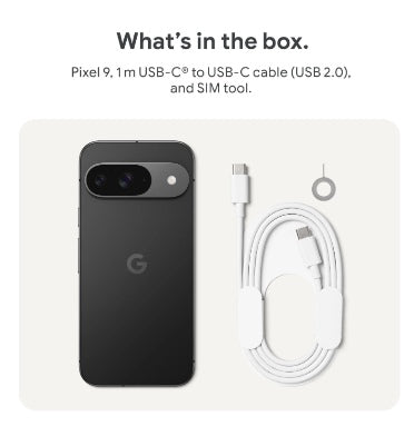 - What's in the box: 1 x Pixel 9 Phone, 1 m USB-C® to USB-C® cable (USB 2.0)