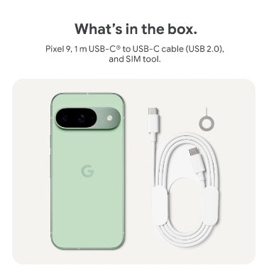 - What's in the box: 1 x Pixel 9 Phone, 1 m USB-C® to USB-C® cable (USB 2.0)