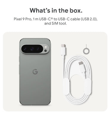 - What's in the box: 1 x Pixel 9 Pro Phone, 1 m USB-C® to USB-C® cable (USB 2.0)