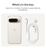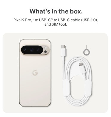 - What's in the box: 1 x Pixel 9 Pro Phone, 1 m USB-C® to USB-C® cable (USB 2.0)
