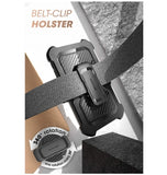 - Detachable swiveling belt clip holster for convenient, hands-free, pocket-free carrying. The case also has a built-in kickstand.