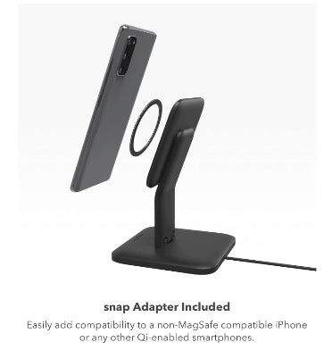 The included snap adapter adds magnetic compatibility to phones that don't have a magnetic feature like MagSafe. Attach the snap adapter to the back of your phone and it’s instantly compatible with the snap+ wireless stand.