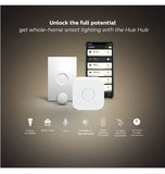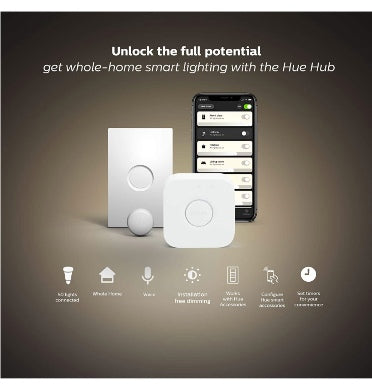 Take automation into your own hands by setting timers or routines, and make it look like you're home when you're away or on vacation. Create light schedules to ease you to sleep, wake you up, and even help you concentrate. The Hue Hub supports a whole-home lighting experience with up to 50 light points, both indoors and out. Your possibilities are limitless with the Philips Hue Smart Light Bulb Starter Kit. Simple. Versatile. Control your Hue smart lighting in one room or several with one simple button. Hue Smart Button makes is easy to quickly switch between light scenes or dim with the slightest touch. Place the button anywhere for full lighting control without your smartphone.