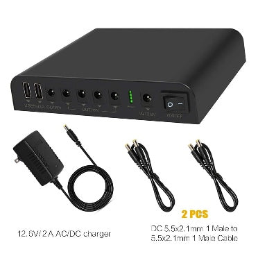 - Package content: 1 x Mini UPS lithium battery, 2 x DC5521 male to male Power Cable, 1 x 12.6V/2A AC/DC Charger