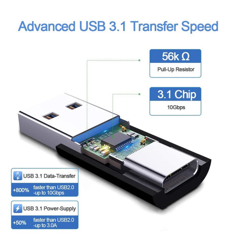- Supporting up to 10Gbps syncing rate, this USB 3.1 to Type C Adapter ensures faster data transferring between PC and smartphones or tablets. *10Gbps is the theoretical Max transmission speed, the final actual speed also depend on output & input device and cable etc. (Since USB A Port does not support PD function,it cannot support PD Protocol Fast Charging)