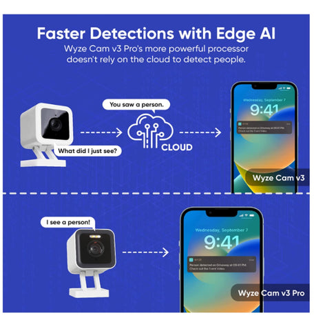 Edge AI detection doesn't rely on the cloud to do it's thinking. For Wyze Cam v3 Pro, that means free, near-instant person detection, right when you need it, with no subscription required.